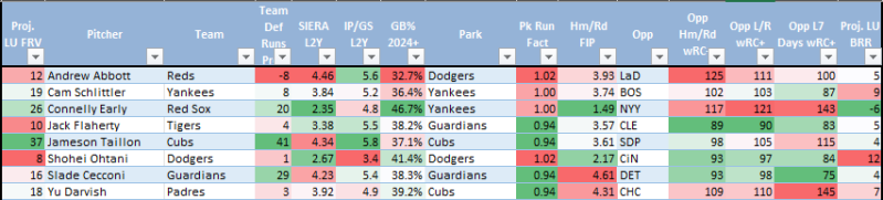 This is a fairly neutral running spot with either pitcher or catcher, while only Ohtani pops with a strong pitch run value matchup against Abbott, though he’s usually not available as a hitter when he pitches. If he were, he’d be on par with Judge as the two top bats on the board. Dodger RHBs would have some value here. Abbott might be the last pitcher I’d consider rostering here.