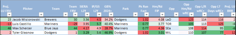 With batters from either side of the plate between a .275 and .320 wOBA and xwOBA against him this year, Misiorowski had a standard 42 point split by actual wOBA, but a 21 point reverse split by xwOBA. The projected Dodger LU against a RHP (which he may not see here, depending on what the Dodgers think the Brewers are doing) averaged a 123 wRC+ and .204 ISO against them. This lineup has averaged a 112 wRC+ in the post-season.